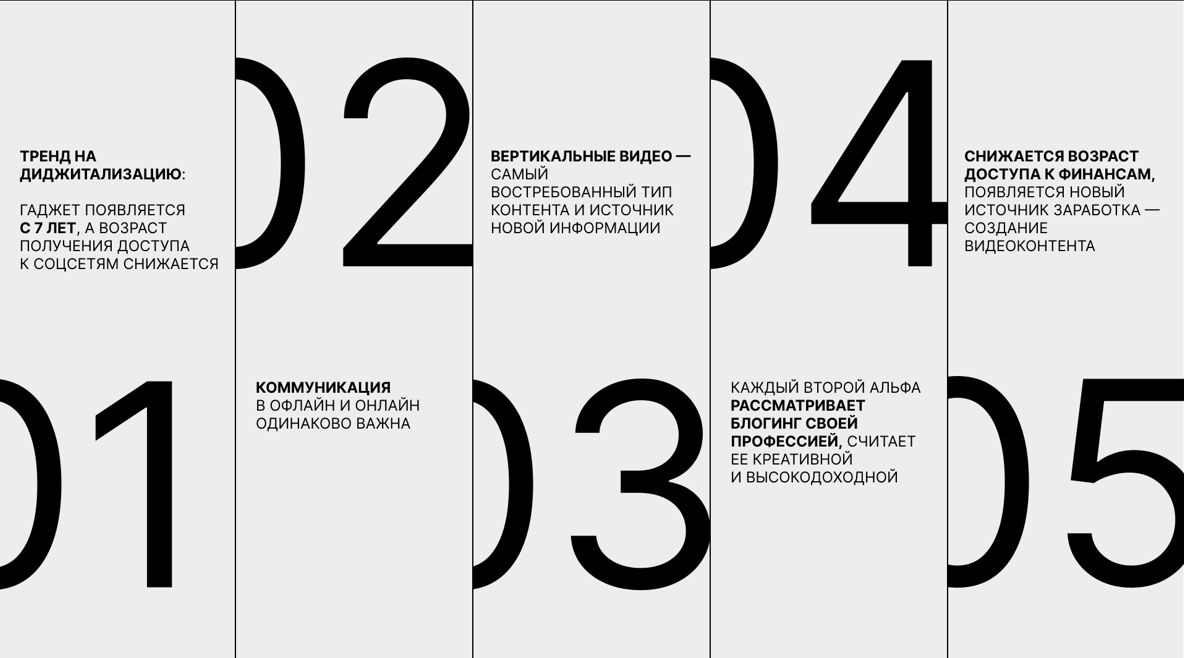 Важно знать, что «альфа» — дети, которые буквально родились с телефоном в руках. Это поколение обладает преимущественно клиповым мышлением, наилучшим образом воспринимая информацию в виде коротких мобильных роликов. Ему не чужда коммуникация. Однако в отличие от своих предшественников, «альфа» целиком и полностью предпочитают онлайн-форматы, которые ограждают их от столкновения с реальным миром. Многие из них видят в блогинге будущую профессию, а также рано начинают осваивать вопросы финансов. Пока поколение «альфа» не стало ядром, принимающим решения. Однако бизнесу уже стоит принимать во внимание потребности именно этой аудитории, ориентируясь на неё как на сегмент будущего.