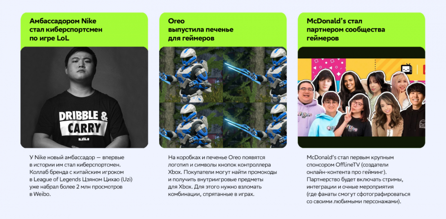 На игровые сообщества всё больше внимания обращают крупные мировые франшизы и бренды, для которых геймеры не являются целевой аудиторией. Компании, которые ориентируются на молодёжь, сотрудничают с киберспортсменами, поддерживают игровые сообщества и используют гейминг-культуру в своих коммуникациях.