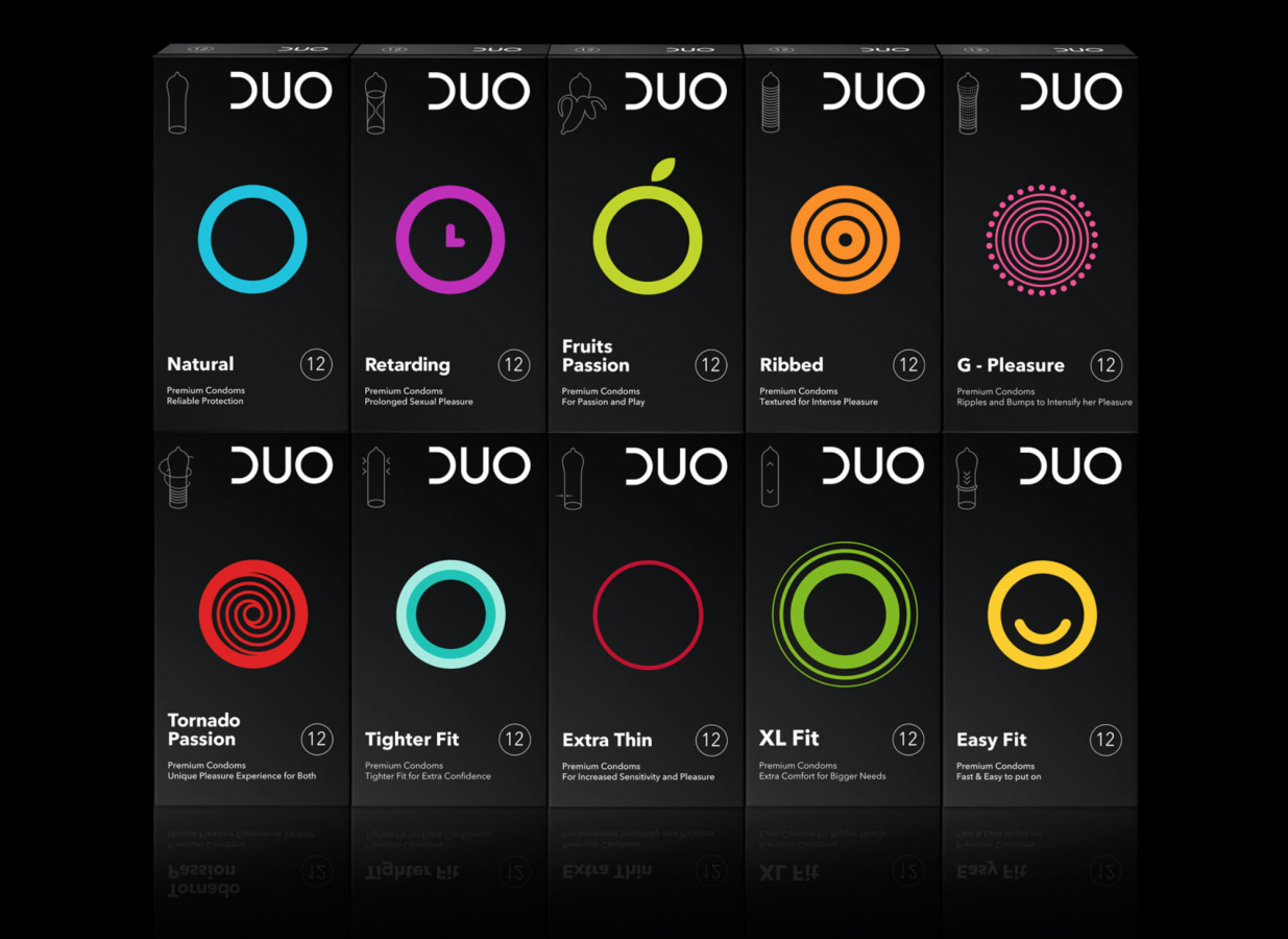 Для дизайна упаковки презервативов DUO греческое агентство mousegraphics разработало множество показательных пиктограмм с простой и понятной геометрической фигурой — кругом. Пример творческого подхода к классификации и визуализации использования изделий.