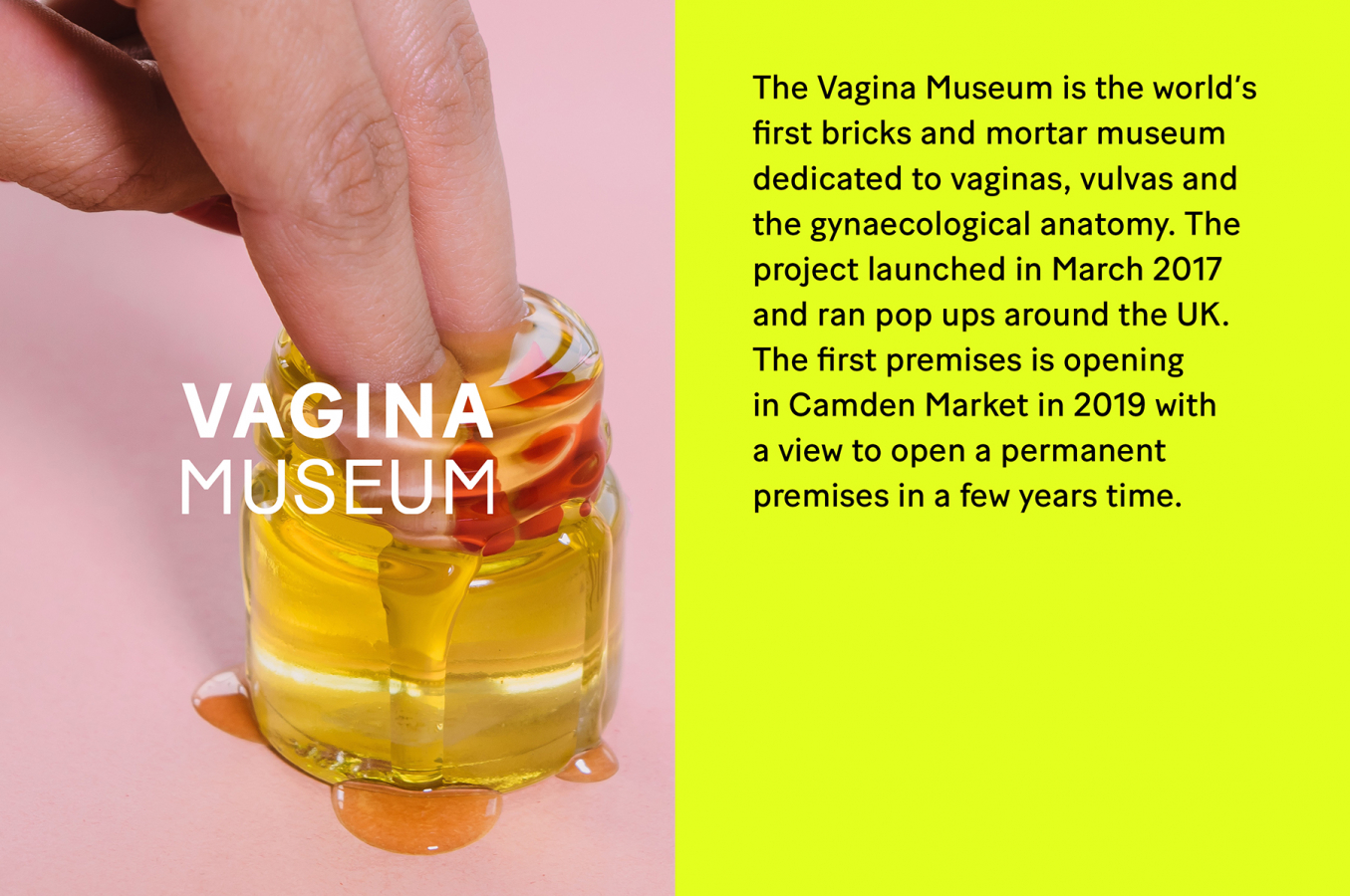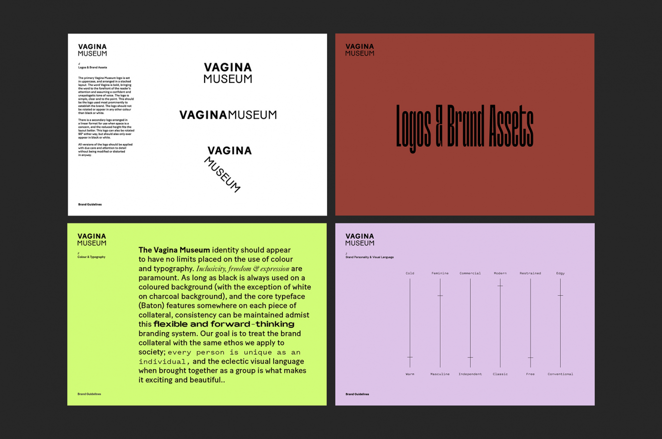 Айдентика Vagina Museum в Лондоне построена на семи шрифтах и семи фирменных цветах, которые отображают бунтарство, свободу, инклюзивность и индивидуальность. Разные комбинации шрифтов и цветов символизируют голоса и личности бренда. Каждый человек уникален, и эклектичный визуальный язык делает его привлекательным и красивым. Красота — в разнообразии.