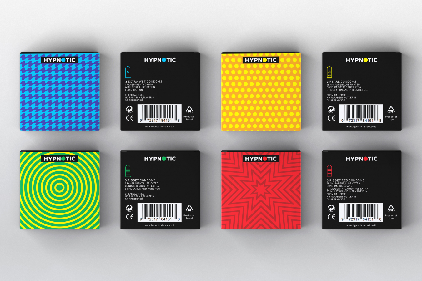 Гипнотически-сумасшедший дизайн пакетиков презервативов от израильского студента-дизайнера предназначен для подростков и молодых людей 16−25 лет, которые не привыкли пользоваться защитным средством. Такой формат должен привлечь внимание молодого поколения и стать бенчмарком для покупки и использования.