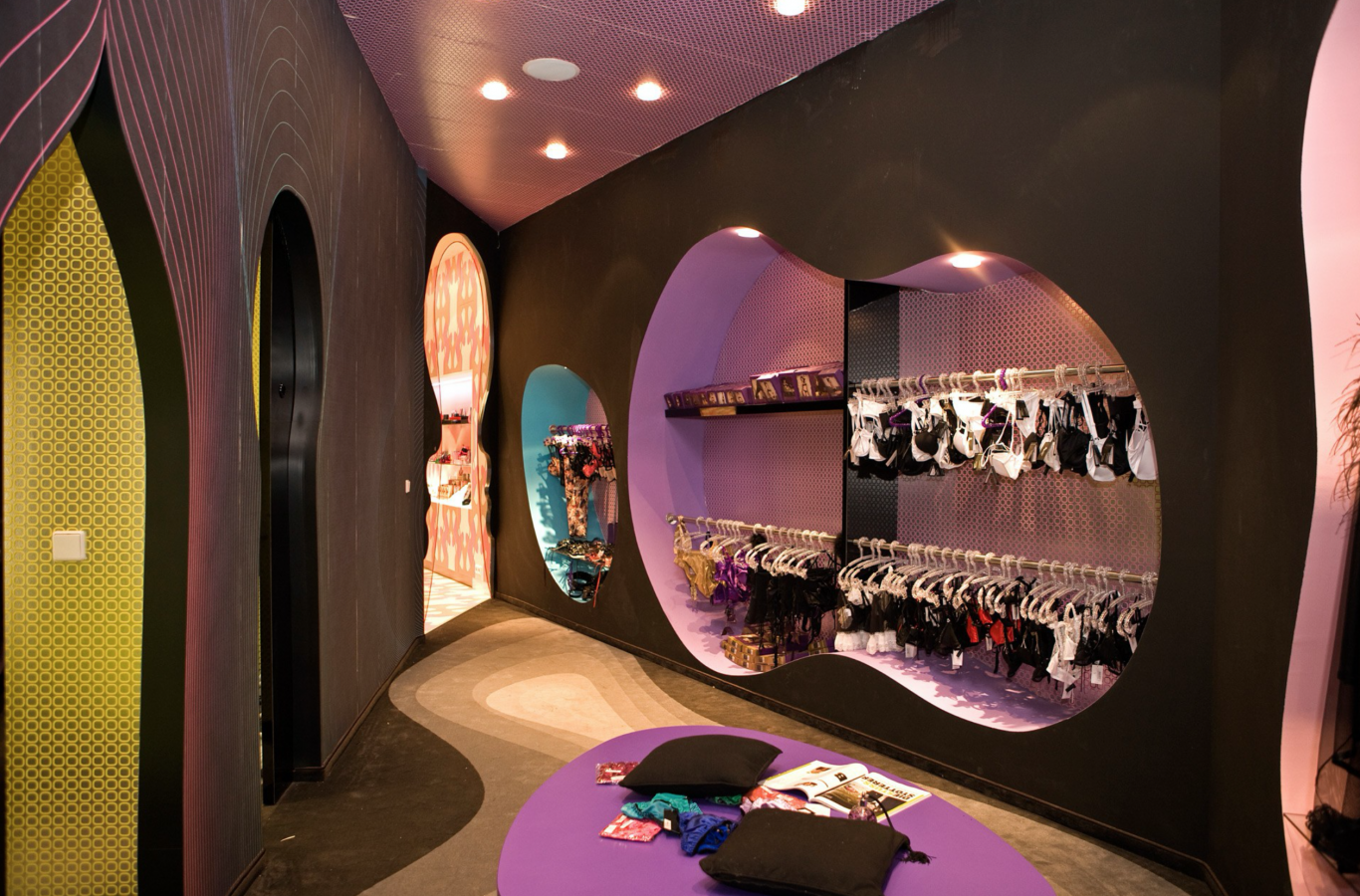 Пространство современных секс-шопов с невероятным ассортиментом стали напоминать магазины игрушек или кондитерские, где у покупателей разбегаются глаза. Мировая легенда дизайна Карим Рашид воссоздал такую атмосферу в неоновых и пастельных тонах для сети интим-шопа Fun Factory.