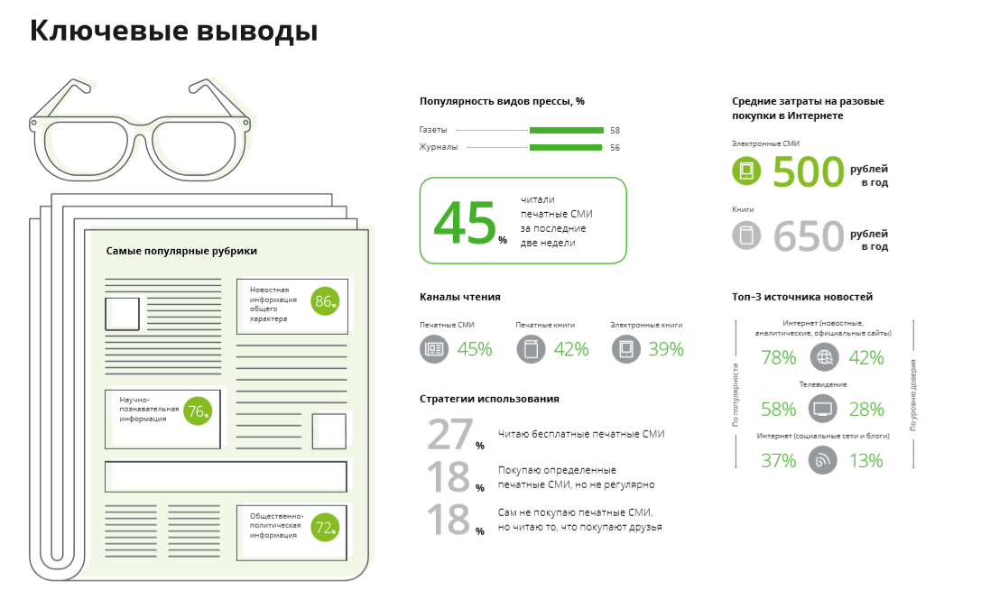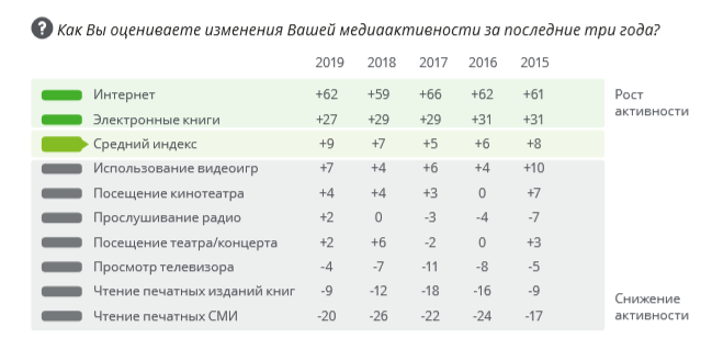 Доля наиболее медиаактивных россиян за прошедший год снизилась на 3 п. п. и составила 83%. Продолжает расти частота использования интернета, а также чтения электронных книг. В то же время, исходя из субъективного ощущения медиапотребления, респонденты указали на заметное сокращение объемов чтения печатных книг и печатных СМИ, а также просмотра телевидения. Здесь, по мнению экспертов, россияне столкнулись с трудностями при переходе на цифровое ТВ, среди которых необходимость приобретения дополнительного оборудования по высокой стоимости и сложности с его установкой.