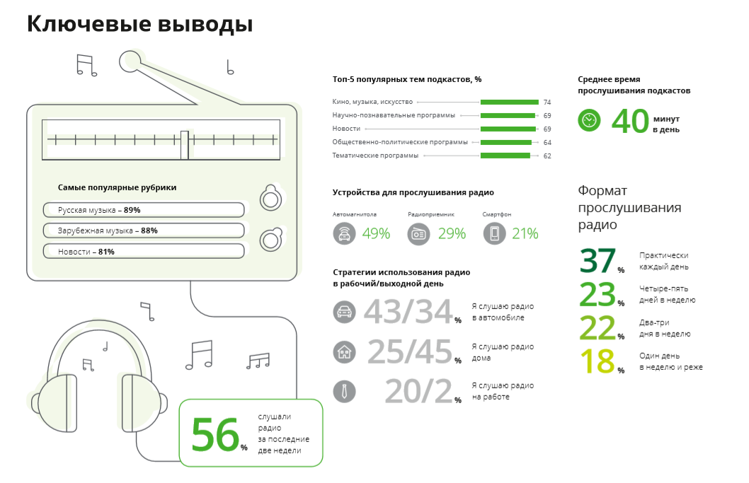Несмотря на некоторое снижение аудитории радио, среди тех, кто продолжает его слушать, в 2019 году зафиксирован небольшой рост частоты прослушивания — первое увеличение за пять лет. Похожая ситуация наблюдается и в отношении посещения театров и концертов: доля посетителей несколько снизилась, но оставшиеся ходят чаще.