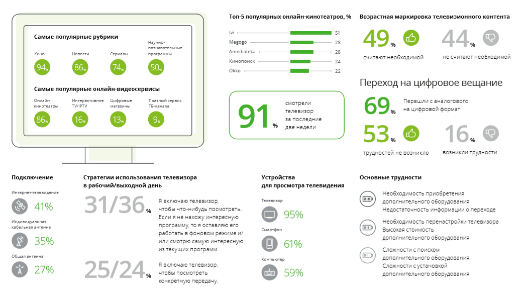 Исследование подтверждает прошлогодние международные прогнозы о том, что в большинстве стран объем просмотра телевизора молодежью продолжит планомерно снижаться и качественно изменяться: люди 18−24 лет все больше времени проводят за просмотром различных сервисов потокового видео, таких как онлайн-кинотеатры или YouTube, отказываясь от просмотра телевизора.