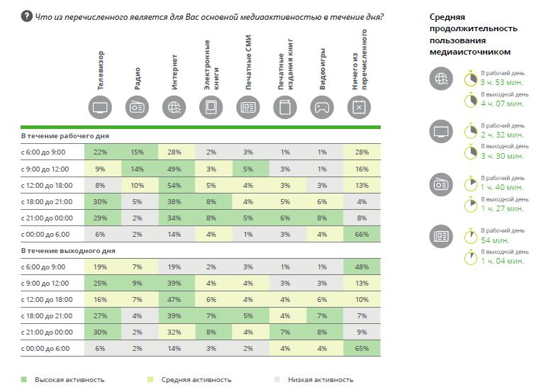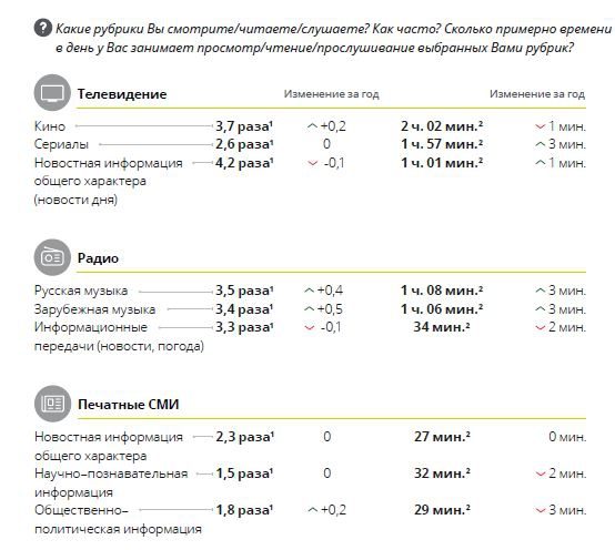 По телевидению люди чаще всего смотрят новости, однако больше всего времени они тратят на кино — в среднем 2 часа и 2 минуты ежедневно. На радио русская и зарубежная музыка пользуются примерно одинаковой популярностью, в отличие от новостей. В интернет респонденты чаще всего выходят для поиска определенной информации (83%), проверки новостей в соцсетях (69%), неформального (67%) и делового общения (65%).