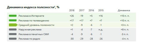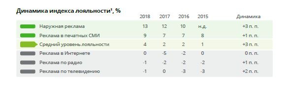 Отрасли удалось переломить негативный тренд, и в 2018 году уровень лояльности к digital вырос на 5 п. п. В целом индекс лояльности к рекламе вырос незначительно (на 2 п.п.) и составил 4%. Последние четыре года этот показатель постепенно растет, в первую очередь за счет более позитивного отношения к наружной и телевизионной рекламе.