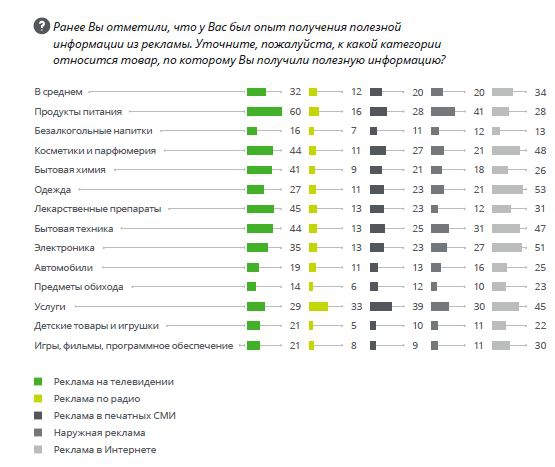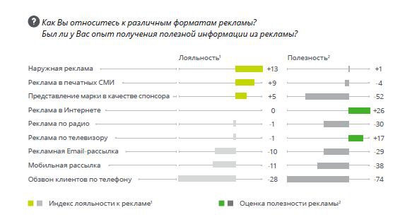 При этом оценки лояльности и полезности различных форматов отличаются. Наиболее полезной опрошенные считают интернет-рекламу (26%) и рекламу на ТВ (17%). Аутсайдером здесь также является обзвон по телефону (-74%). Спонсорство тоже не отличается пользой по мнению россиян — это связано с тем, что такая реклама используется для формирования положительного образа бренда, а не для донесения конкретной информации до потребителя.