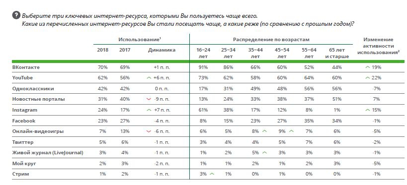 Самыми популярными интернет-ресурсами являются «ВКонтакте», YouTube и «Одноклассники». Заметный рост популярности наблюдался у YouTube (+6 п.п.) и Instagram (+7 п.п.). Вместе с тем снизилась популярность новостных порталов (-9 п.п.), что объясняется переходом аудитории на сторонние ресурсы. Например, подписка на новостные порталы в соцсетях избавляет от необходимости посещать основной сайт.