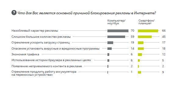 Определенное улучшение настроений по поводу рекламы сопровождается широким использованием программ, блокирующих рекламу: каждый третий россиянин блокирует рекламу в интернете. Соответственно, перед бизнесом встает еще один вопрос — как вернуть свою целевую аудиторию и подтолкнуть пользователей отказаться от блокирования рекламы.