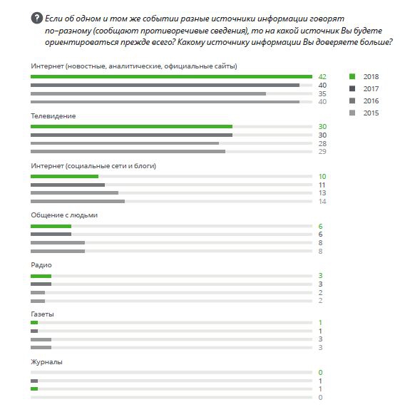 На втором месте среди источников информации находится телевидение, на третьем — социальные сети и блоги. Уровень доверия к интернету (новостным, аналитическим и официальным сайтам) увеличился на 2 п.п. по сравнению с 2017 годом, доверие к ТВ осталось прежним, уровень доверия к блогам и соцсетям снизился на 1 п.п.