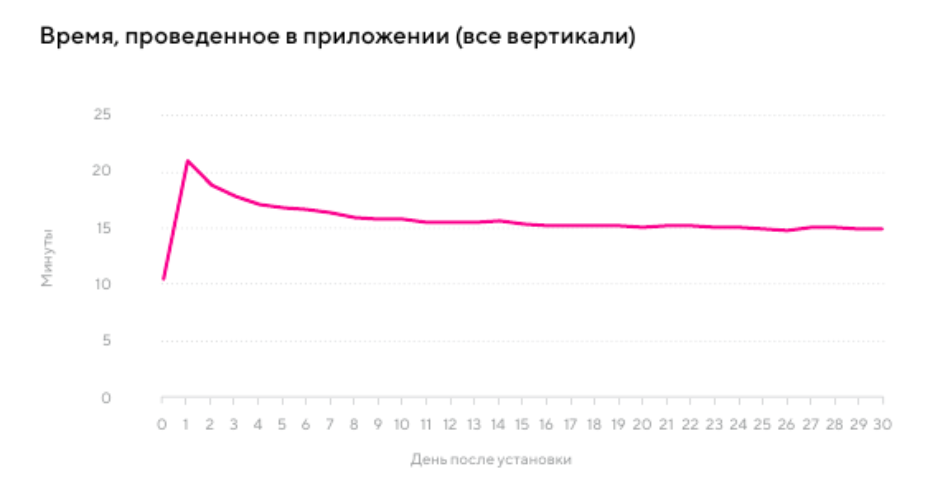 С нулевого по первый день после установки проведенное в приложении время практически удваивается по всем вертикалям: за каждые 24 часа оно увеличивается с приблизительно 10 минут до 20 минут. К третьему дню оно уменьшается до 17 минут и достигает стабильного значения в 14 минут на тридцатый день.
