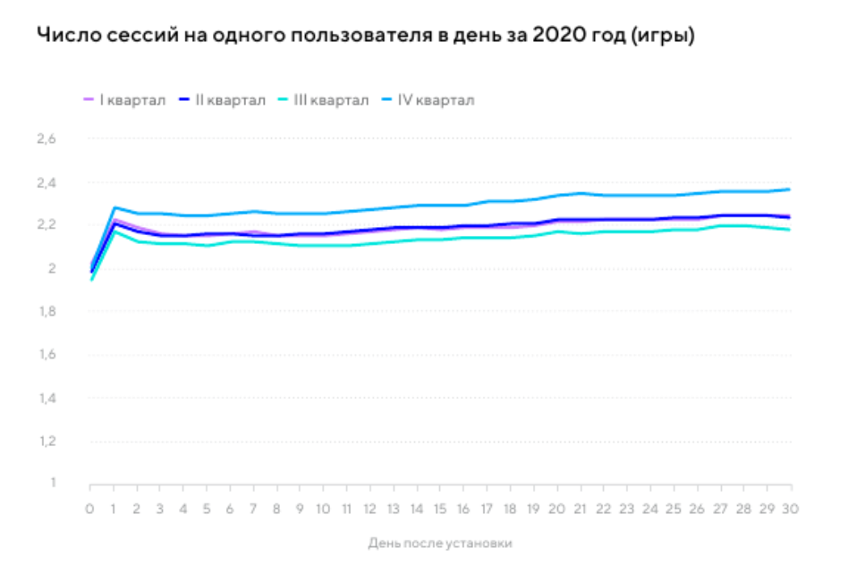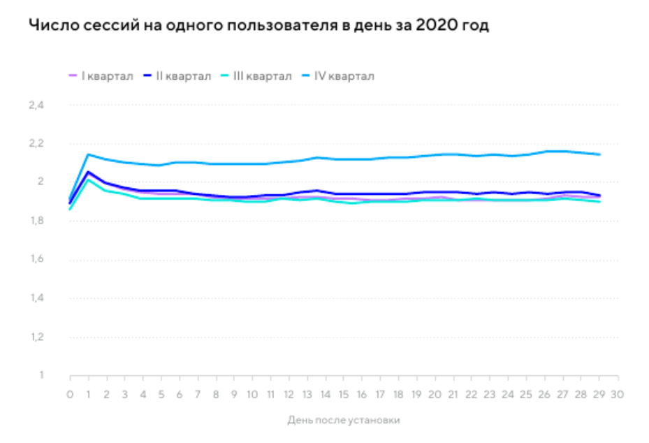 Помимо большого количества новых установок и сессий, в 2020 году также отмечена высокая активность пользователей в приложениях. Каждый пользователь из нашей когорты за 30 дней в среднем открывал приложение дважды в день — и это впечатляющий результат.
