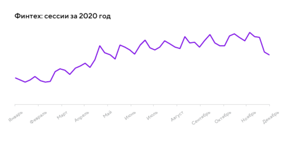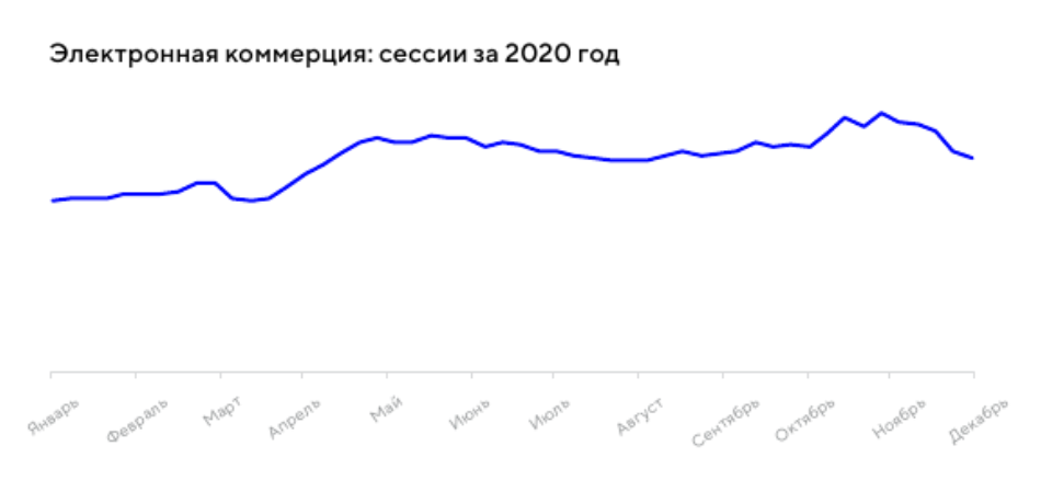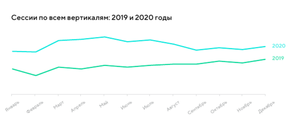 В целом количество сессий в 2020 году по сравнению с 2019 годом увеличилось на 30%, и этот рост продолжается и в 2021-м (пока что на 4,5%). Апрель 2020-го стал наиболее успешным месяцем, где этот показатель увеличился на 45% YoY.
