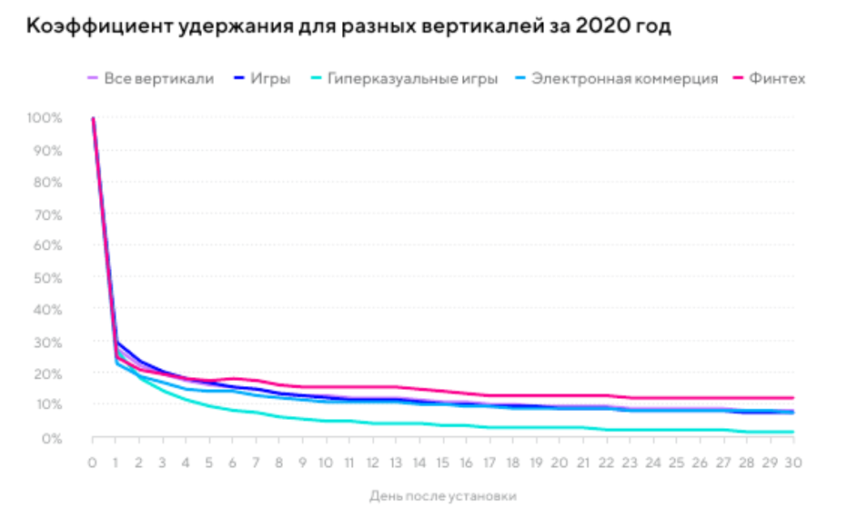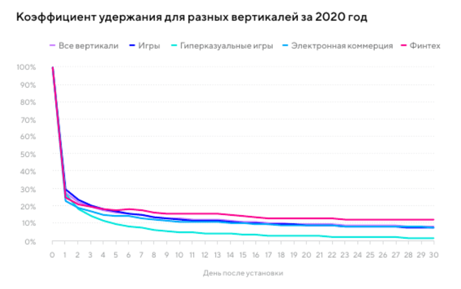 При этом финтех-приложения становятся лидерами по показателю возвращающихся пользователей — 18% на седьмой день и 12% на тридцатый. Электронная коммерция также показывает неплохие результаты — 13% на седьмой день и 8% на тридцатый, так что, несмотря на низкий процент новых установок — 6%), привлеченные пользователи имеют высокую мотивацию продолжать работу с приложением.