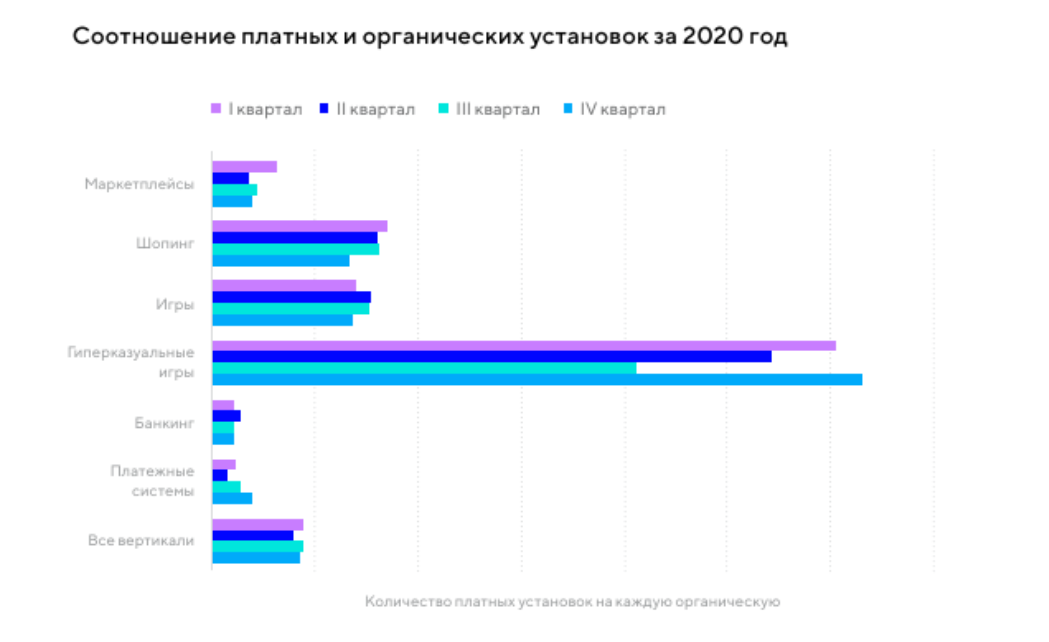 В сегменте гиперказуальных игр соотношение платных установок к органическим наиболее высокое: на четвертый квартал оно достигло значения 3,17, что значительно больше общего результата игровой индустрии за тот же квартал — 0,69.