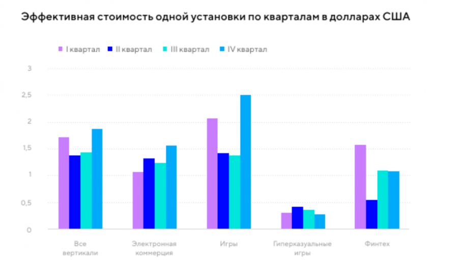 Дороже всего привлечение новых пользователей во всех сферах обходилось в четвертом квартале с медианной стоимостью установки в $1,88. В электронной коммерции цена выросла с $1,06 в первом квартале до $1,56 в четвертом. Для финтеха, напротив, стоимость установки была наиболее высокой в первом квартале — $1,57. Во втором квартале она снизилась до $0,53.