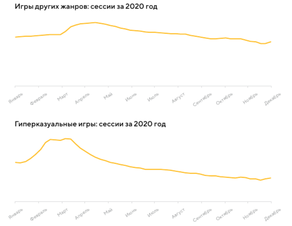 Рост количества сессий финтех-приложений в 2020 году составил 85% YoY, а за 2021 год этот показатель прибавил еще 35%. Количество сессий в гиперказуальных играх в 2020 году увеличилось на 36% по сравнению с 2019 годом, а у остальных жанров — на 27%. Бум сессий 2020 года начался в конце января и достиг пика в марте, продемонстрировав рост на 72% по сравнению с усредненным годовым значением.