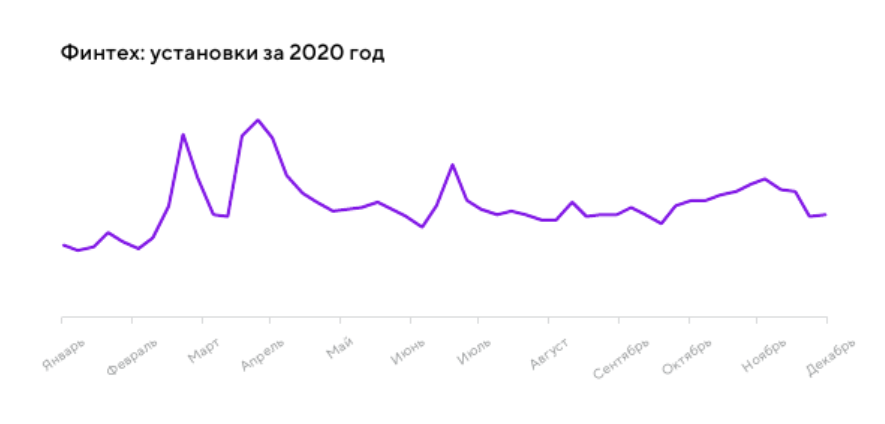 Рост количества установок в сфере электронной коммерции был не слишком большим (всего 6%), однако этот показатель был стабильным в течение всего года. Пики и провалы других вертикалей нехарактерны для этой сферы, так как большую часть года офлайн-магазины были закрыты, и люди активно делали покупки в интернете.