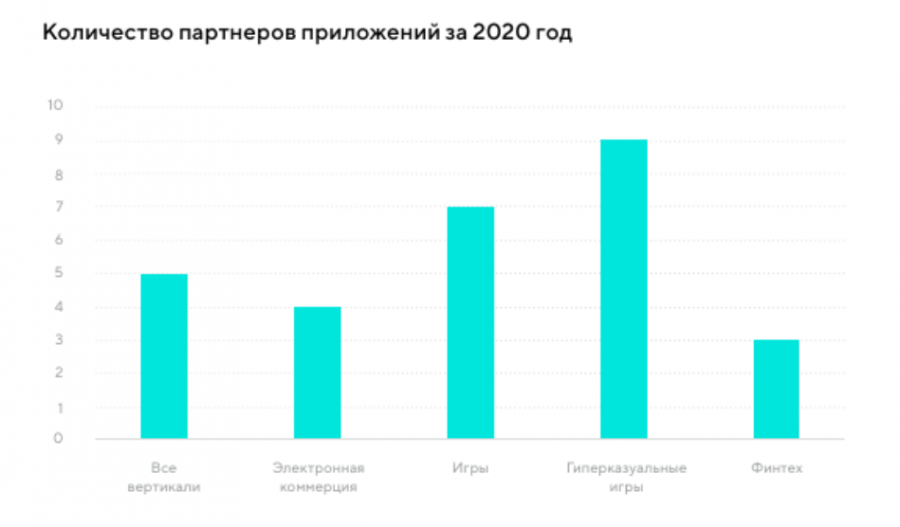 Среднее количество партнеров приложений для всех вертикалей в совокупности колебалось около пяти, а в четвертом квартале 2020 года выросло до шести. В играх этот показатель выше среднего: девять партнеров у гиперказуальных игр и семь у других жанров. Медианное приложение для покупок в интернете работает с четырьмя партнерами, а финтех — с тремя. Соответственно, для этих вертикалей открываются широкие возможности диверсификации и расширения набора партнеров для поиска новой аудитории потенциальных пользователей.