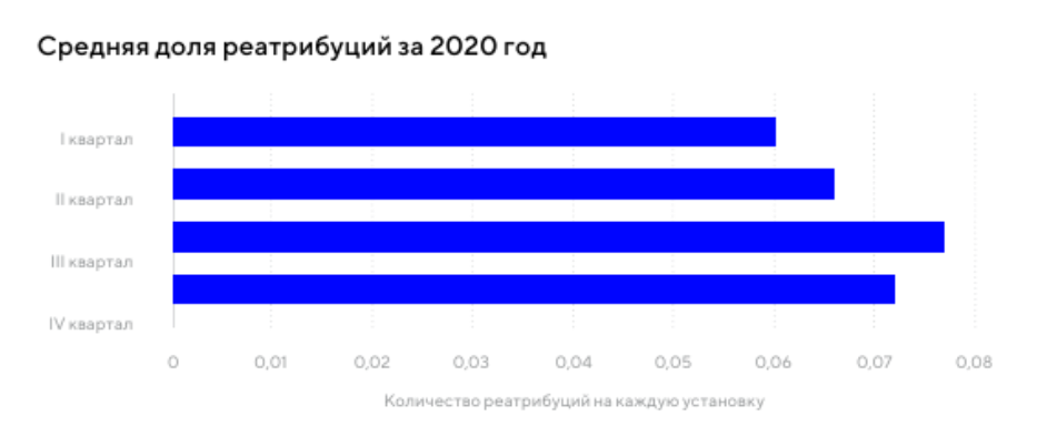 Общая доля реатрибуций (число реатрибуций на каждую установку) за 2020 год выросла с 0,06 за первый квартал до 0,077 в третьем квартале и снизилась до 0,072 в четвертом квартале. Наиболее высокие сравнительные доли реатрибуции были выявлены в банковской сфере и электронной коммерции.