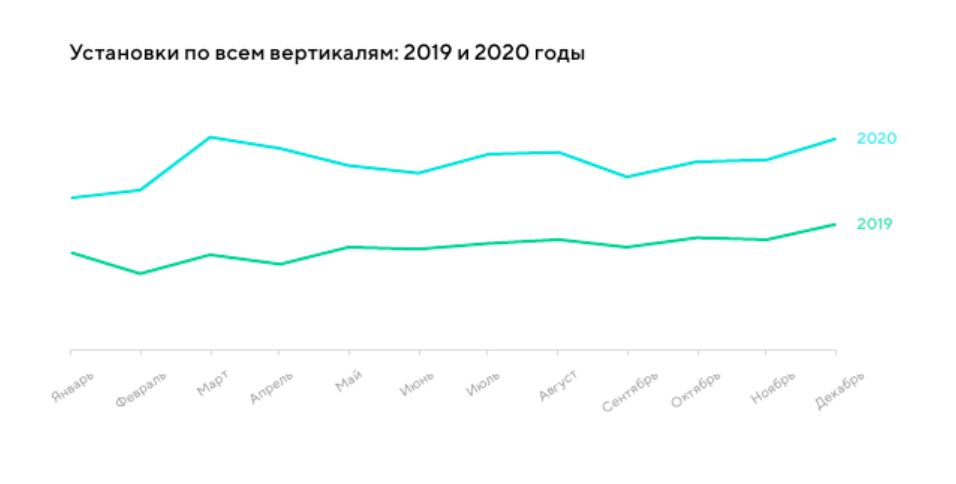 В 2020 году, по сравнению с 2019 годом, количество установок по всем вертикалям увеличилось на 50%. Этот рост наиболее очевиден в марте и апреле 2020 года, в момент введения первых карантинов по всему миру: показатели увеличились на 74% и 76% YoY (year-over-year, по сравнению с прошлым годом). Несмотря на снижение количества установок после этого пика, в 2021 году рост продолжается: результаты первого квартала на 31% лучше, чем в том же периоде за 2020 год.
