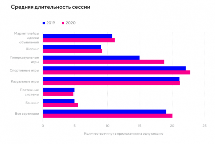 В целом длительность сессии выросла с 19,09 минут в 2019 году до 20,04 минут в 2020, а 2021 год на данный момент показывает значение в 20,31 мин. Все вертикали, кроме платежных приложений, показатели которых несколько снизились, продемонстрировали рост с 2019 по 2020 год.