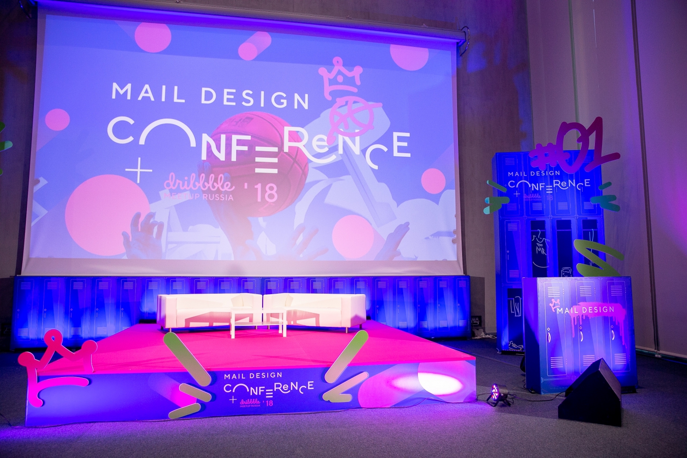 Дизайн-команда Mail.Ru Group посвятила свое выступление работе над стилем Mail.Ru Design Conference + Dribbble Meetup 2018. Как отметили организаторы, миссия конференции — прокачивать дизайнеров, поэтому они пришли к идее разместить шкафчики как в спортзале и баскетбольные мячи с корзиной. Тем более, что сам термин to dribbble пришел из баскетбола и означает «ведение мяча».