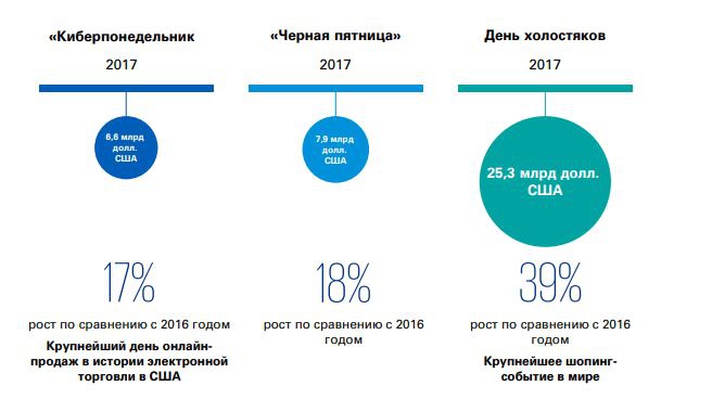 Так, в 2017 году выручка Alibaba от продаж товаров в День холостяков (11 ноября) достигла рекордных 25 млрд долларов, существенно превысив аналогичный показатель «Киберпонедельника» и «Черной пятницы» вместе взятых. В истории США крупнейшим днем онлайн-продаж стал «Киберпонедельник» с рекордом в 6,59 млрд долларов.
