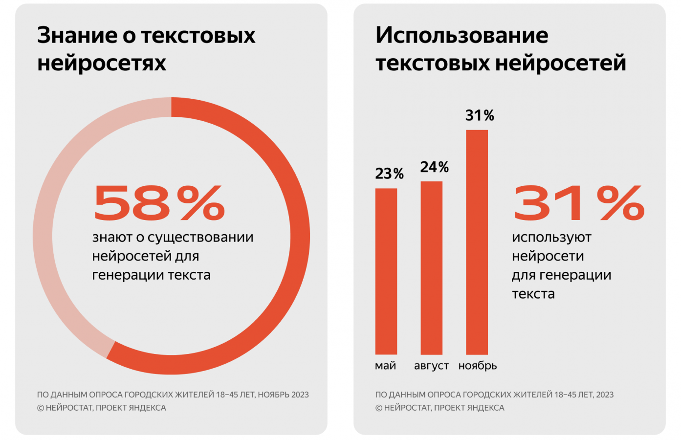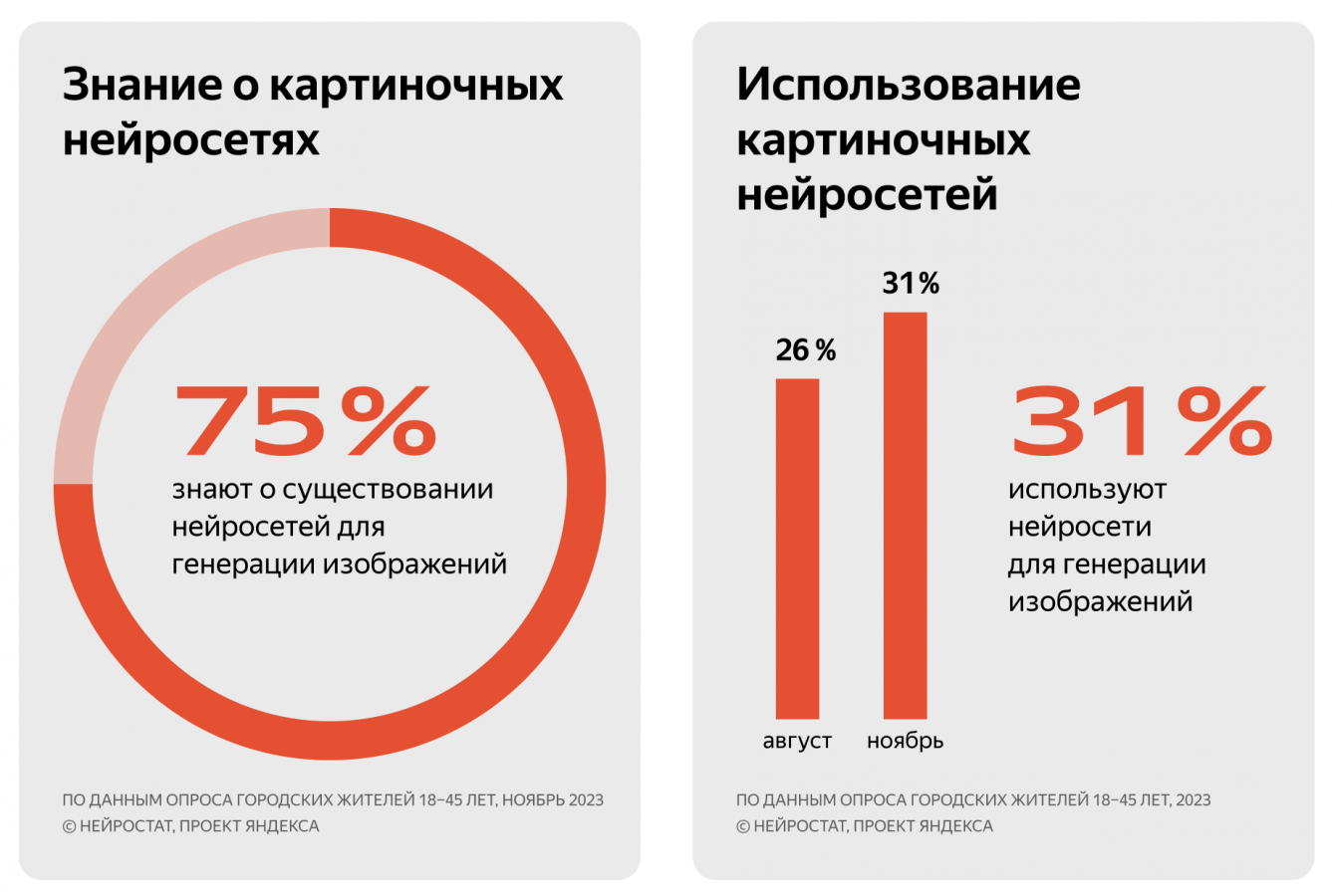 По данным «Нейростата», знание о генеративных языковых моделях за август-ноябрь 2023 года практически не изменилось. В конце лета о них слышали 57% участников опроса, а осенью — 58%. При этом число интернет-пользователей, которые пробовали создавать тексты с помощью нейросетей, выросло с 24% до 31%. В мае показатель составлял 23%.