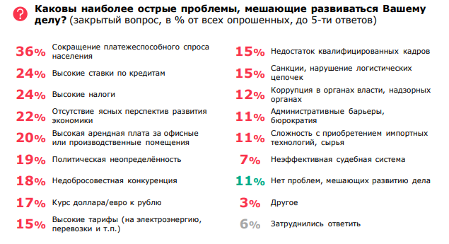 Каждый третий молодой предприниматель собирается инвестировать в развитие своего дела. Каждый пятый, напротив, планирует экономить, каждый седьмой — выживать. Более трети предпринимателей называют сокращение платежеспособного спроса населения основной проблемой, стоящей перед ними.