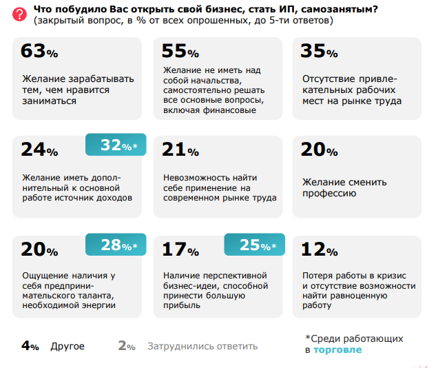 Большинство молодых людей от 14 до 35 лет открывают свой бизнес потому что хотят заняться любимым делом, побольше зарабатывать и не иметь начальства. Почти для четвери опрошенных бизнес — это подработка.