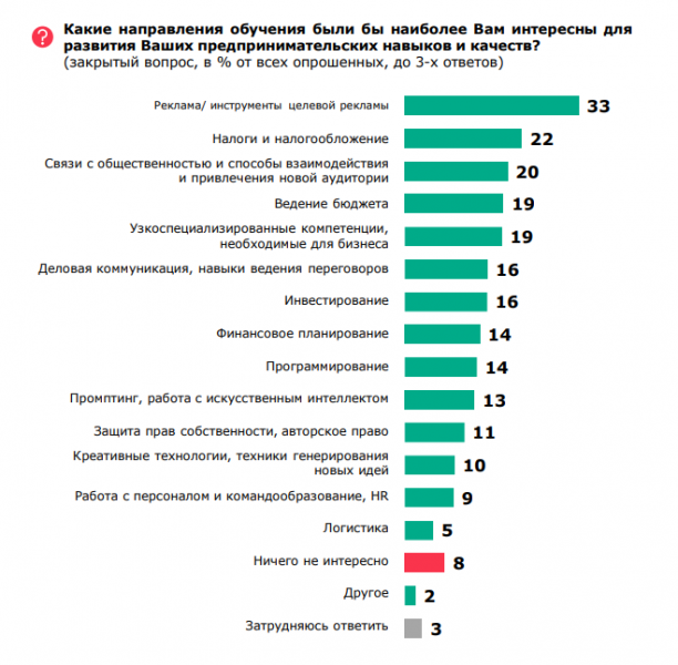 46% предпринимателей для дальнейшего развития стремятся получить специализированное обучение. На первом месте для них, с заметным отрывом, стоит обучение рекламе и инструментам целевой рекламы. Также востребовано ведение бюджета и программирование.