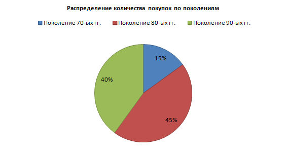 Главные «поколенческие» показатели, которые необходимо учитывать — соотношение количества покупок и объем доходом. Поколение 80-ых гг. — несомненно, лидер потребительского войска. Они и покупают больше всех, и тратят больше всех. Несмотря на то, что поколение 90-ых покупает очень много, средний чек в разы ниже среднего чека поколения 70-ых гг.
