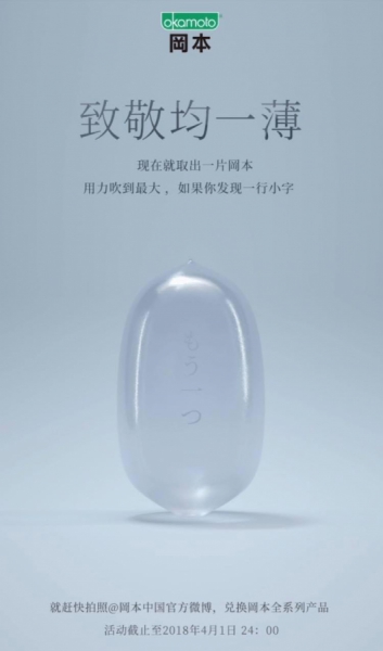 В прошлом году нас порадовала японская компания, выпускающая презервативы, под всемирно известным брендом Okamoto. Производители предлагают надуть презерватив — и если на изделии вдруг проступит надпись «もう一つ» — вам несказанно повезло. Необходимо срочно сфотографировать изделие № 1 и отправить фото организаторам для получения специального приза. Японское качество, японские технологии, японский юмор.