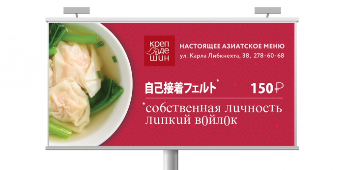 Агентство Red Pepper представило аутентичную рекламу ресторана паназиатской кухни «Креп де Шин». В рекламных принтах наименования любимых блюд азиатской кухни перевели на русский язык, как это делают во многих отечественных и зарубежных ресторанах. Креаторы объяснили что, помимо привлечения внимания айдитории к рекламе, некорректный перевод блюд из меню позволит лучше передать аутентичность ресторана «Креп де Шин».