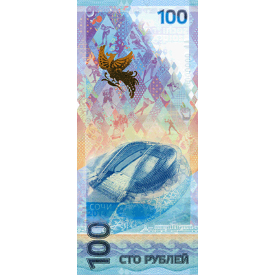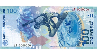 Основными изображениями лицевой стороны банкноты являются фигура сноубордиста, а также Олимпийские объекты прибрежного кластера в Сочи. На оборотной стороне изображен Олимпийский стадион «Фишт». Преобладающий цвет банкноты – синий, тираж памятных купюр составит 20 млн экземпляров.