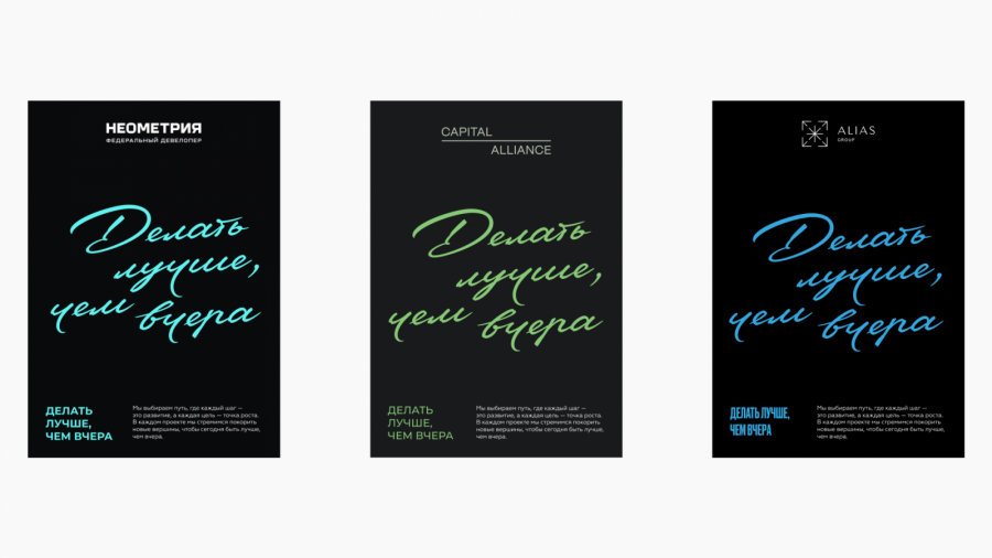 Композиция визуалов строится по модульному принципу: ценности пишутся «корпоративным почерком», логотип фиксирован в верхней части, поясняющий блок — внизу. Эта структура одинакова для всех компаний, что делает систему узнаваемой и цельной. Адаптация происходит через детали: бренды используют собственную палитру и фирменный шрифт.