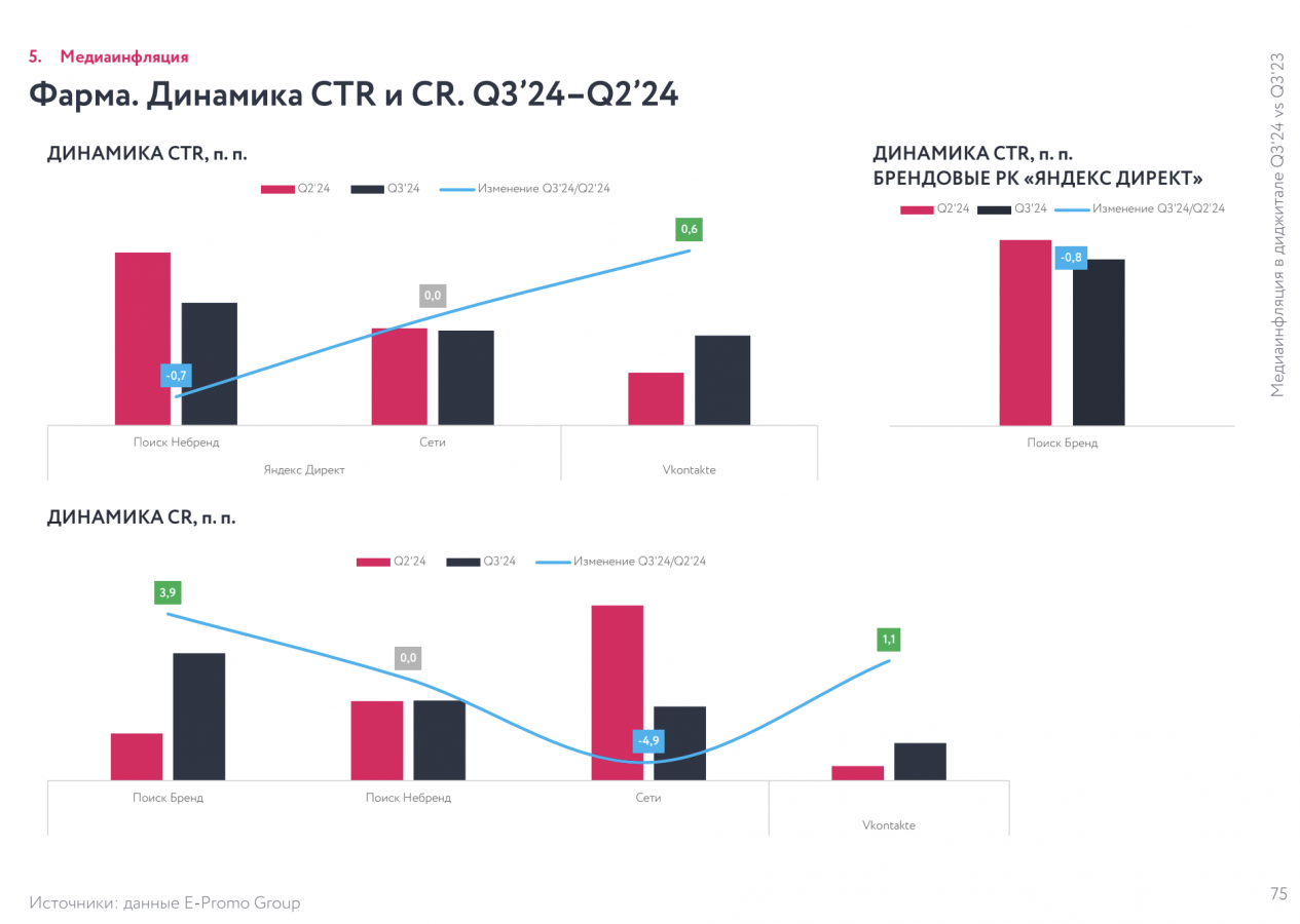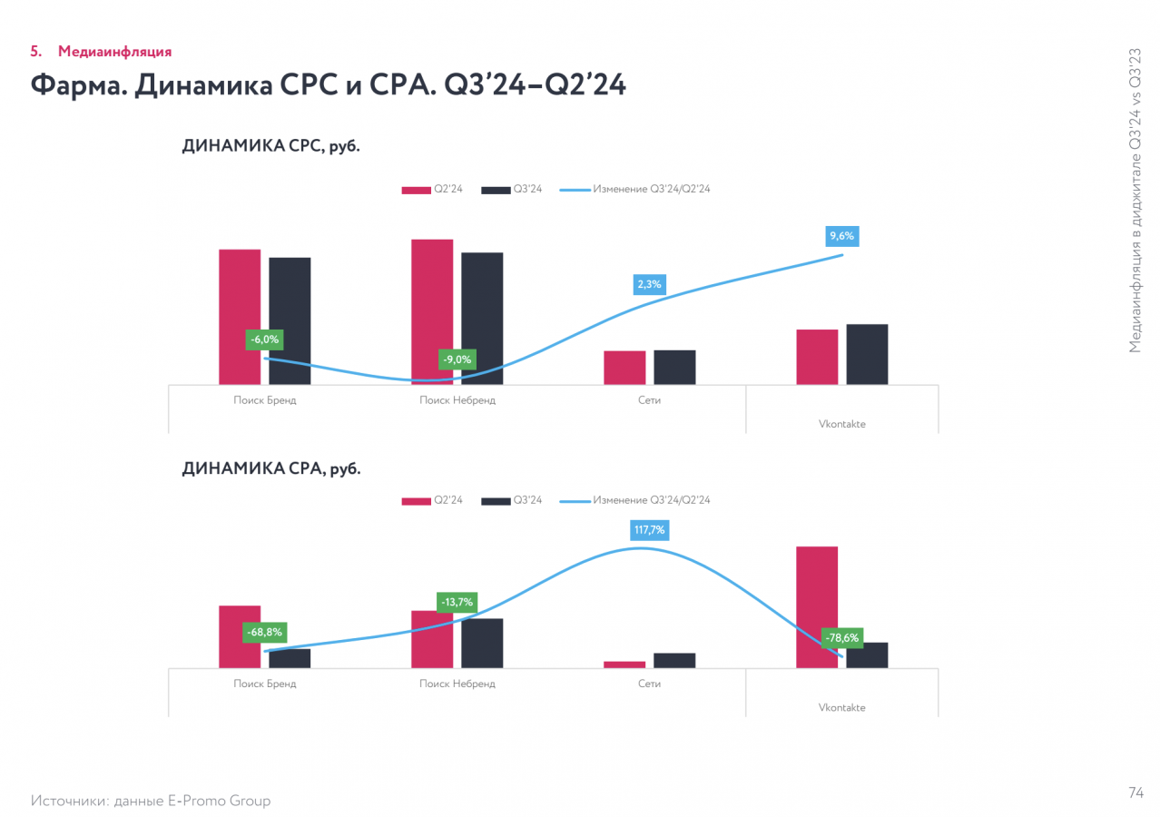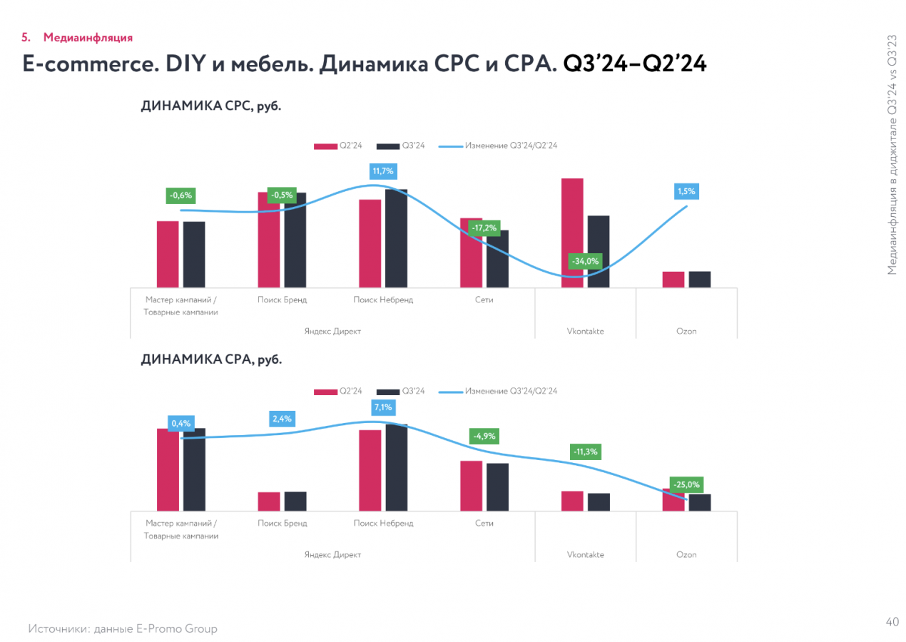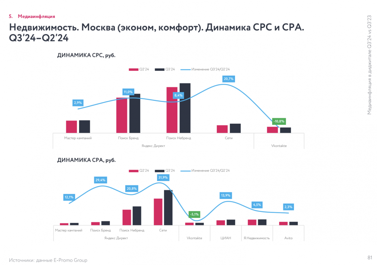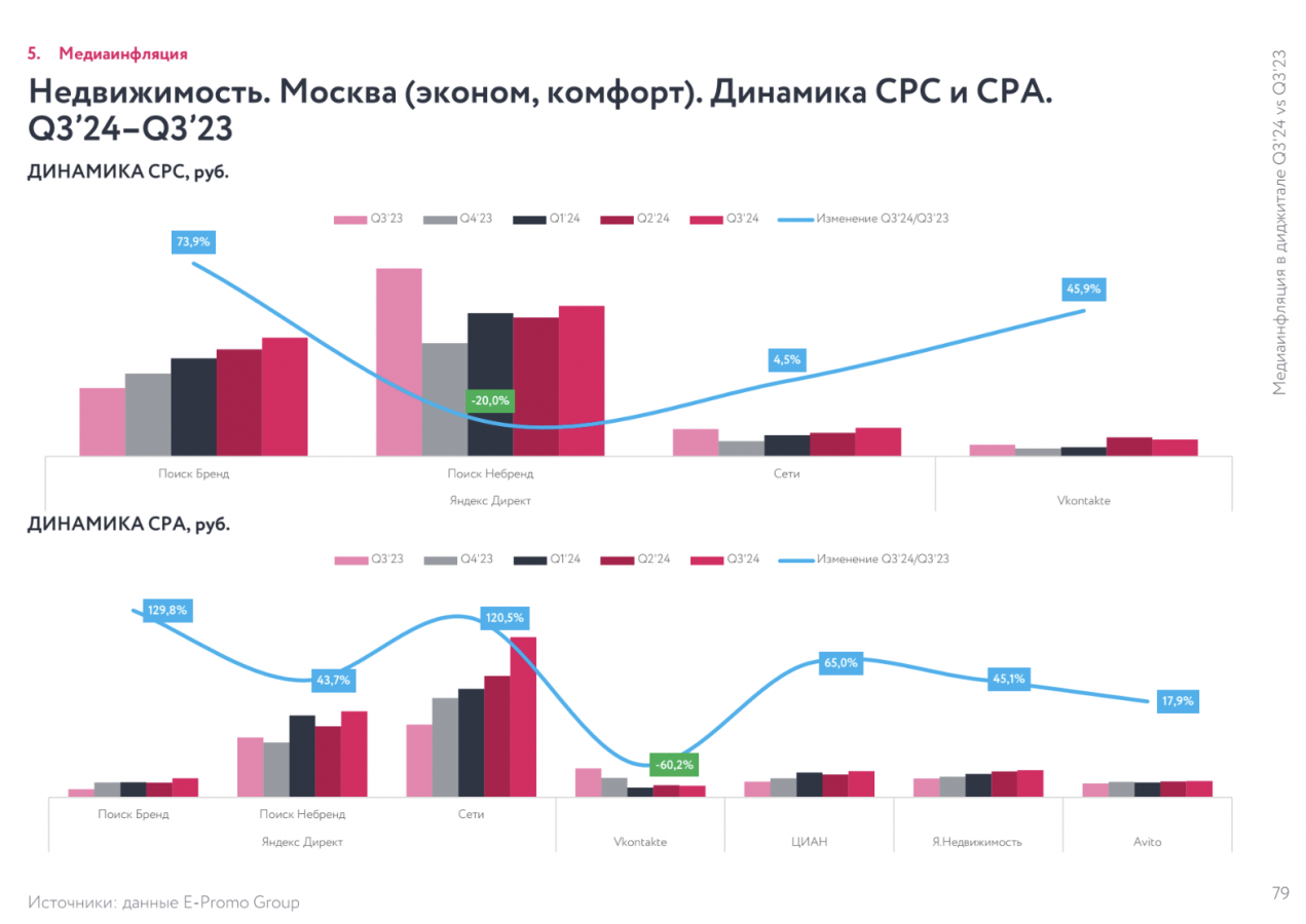 E-Promo Group «Медиаинфляция в диджитале. Q3'24 vs Q3'23 и Q3'24 vs Q2'24», в третьем квартале 2024 года инфляция в перформанс-рекламе показала самое заметное замедление за все семь кварталов, что ведется наблюдение. По сравнению со вторым кварталом 2024-го CPC подорожала всего на 2,6%, а CPA выросла незначительно — на 3,2%.