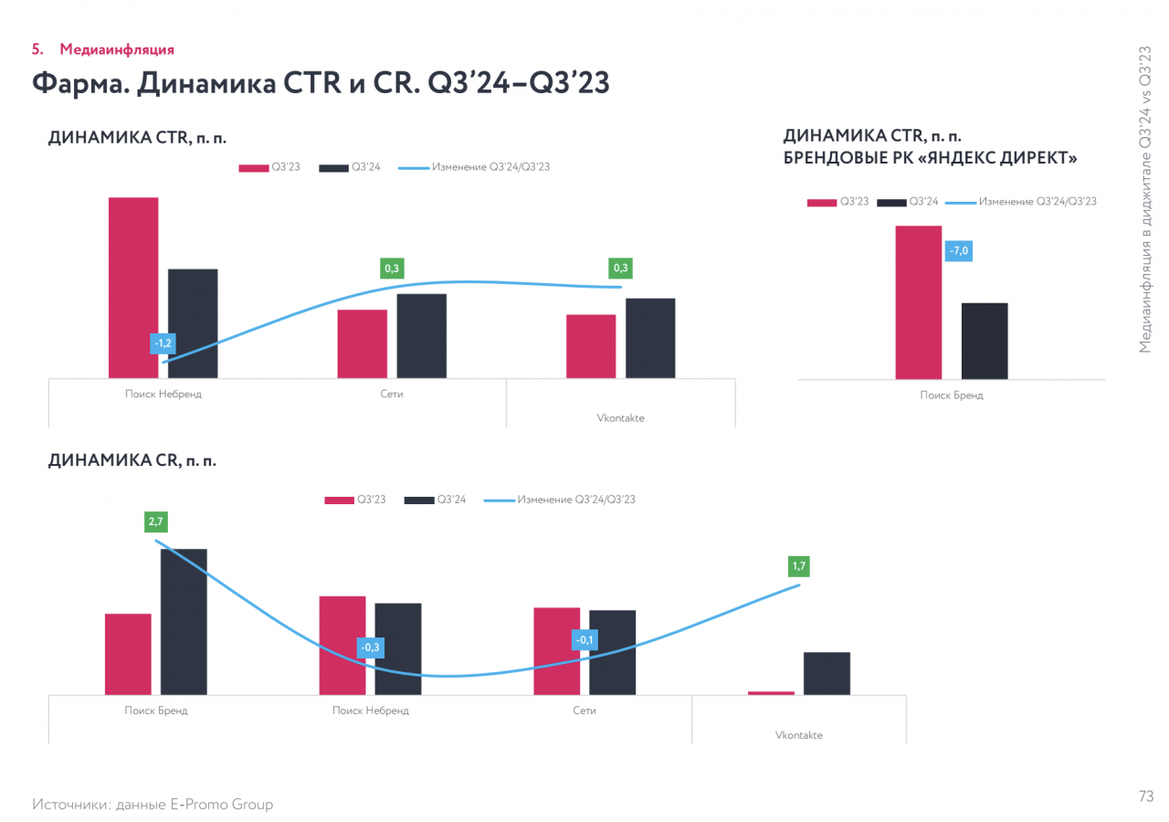Дефляция показателей отображает тренд на повышение эффективности рекламных кампаний за счет использования большего количества автостратегий и более гибкого подхода у фармпроизводителей к таргетингам. По сравнению со вторым кварталом 2024-го стоимость клика в среднем по отрасли снизилась на 0,8%, а целевого действия — на 10,8%.