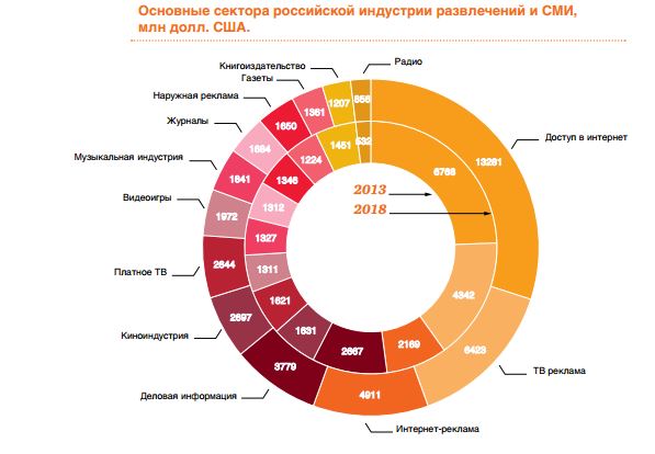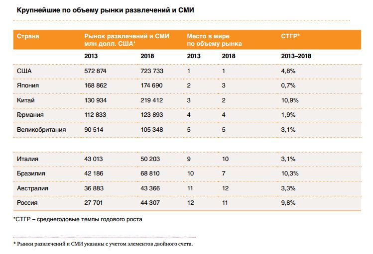 Российский рынок развлечений и СМИ остается одним из самых динамичных в регионе Европы, Ближнего Востока и Африки (EMEA), занимая 5-е место. В мировом масштабе он находится на 12 месте. В 2013 году его динамика развития практически не изменилась: рост составил 10%, а объем рынка достиг 26,7 млрд долларов. По прогнозам, к 2018 году рынок вырастет до 42,1 млрд долларов.