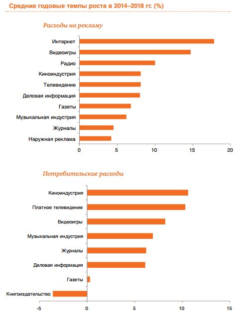 В пятилетней перспективе самыми динамичными сегментами станут интернет-реклама (17,8%), доступ в интернет (14,4%), киноиндустрия (10,6%) и платное телевидение (10,3%). Газеты продемонстрируют низкий темп роста (2,1%), а книгоиздание уйдет в минус (–3,6%).