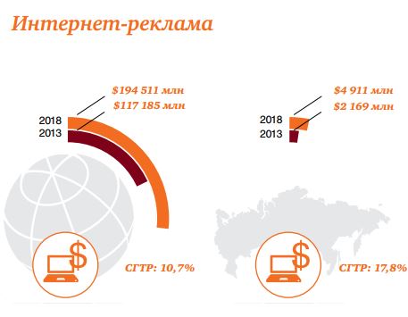 Рынок интернет-рекламы вырастет более чем в 2 раза, с 2,2 до 4,9 млрд долларов, что сделает его четвертым по объему в ЕМЕА и приблизит к рынку ТВ-рекламы (6,4 млрд долларов). Поисковая реклама – преобладающий сегмент объемом 1,43 млрд долларов, что составляет 66% рынка интернет-рекламы. В 2013–2018 годах среднегодовой темп роста поисковой рекламы составит 17%, а сумма доходов достигнет 3,14 млрд долларов.