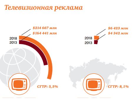 Несмотря на рост цифровых СМИ ТВ-реклама сохранит свои позиции и продолжит стабильный рост на уровне 8,1% в год. В 2018-м рынок достигнет нового рекордно высокого показателя в 6,4 млрд долларов.