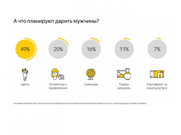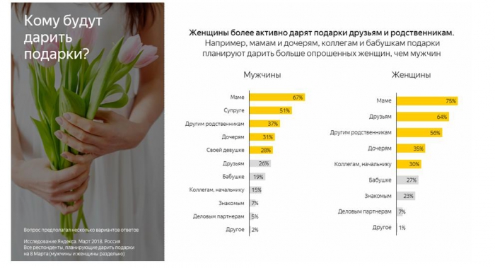 К 8 марта в равной степени готовятся и мужчины, и женщины. Среди мужчин больше тех, кто планирует сделать подарок одному человеку, а среди женщин распространено делать подарки 6−10 людям. Мужчины чаще всего ищут подарок для мамы, супруги и дочери, а женщины для мамы, подруг, дочек и коллег по работе. Почти 19% мужчин предпочитают покупать подарки ближе к празднику, из них 5% собираются за покупками непосредственно 8 марта.