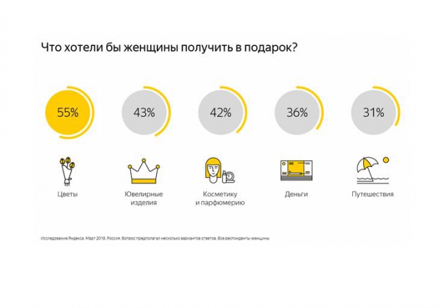 Аналитики «Яндекса» изучили спрос российских пользователей в интернет-магазинах перед 8 Марта и провели опрос респондентов, на основе чего составили рейтинг подарков к Международному женскому дню.