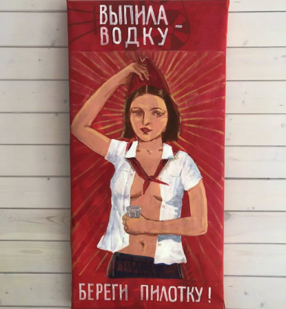 На постере, пародирующем советские плакаты, изображена полураздетая девушка в пионерском галстуке и в пилотке с граненым стаканом в руке. Картину сопровождает надпись: «Выпила водку — береги пилотку».