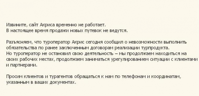 Еще один российский туроператор объявил о невозможности выполнить обязательства по ранее заключенным договорам реализации турпродукта. На этот раз речь идет об одном из старейших новосибирских туроператорах — «Акрис». Сайт компании временно не работает, продажи путевок не ведутся.