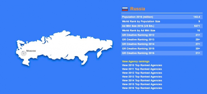Россия вошла в TOP-25 самых награждаемых стран по версии Gunn Report. По итогам 2016 года она заняла 21 место. Наша страна показала такой впечатляющий результат впервые за всю историю существования международного рейтинга креативности.