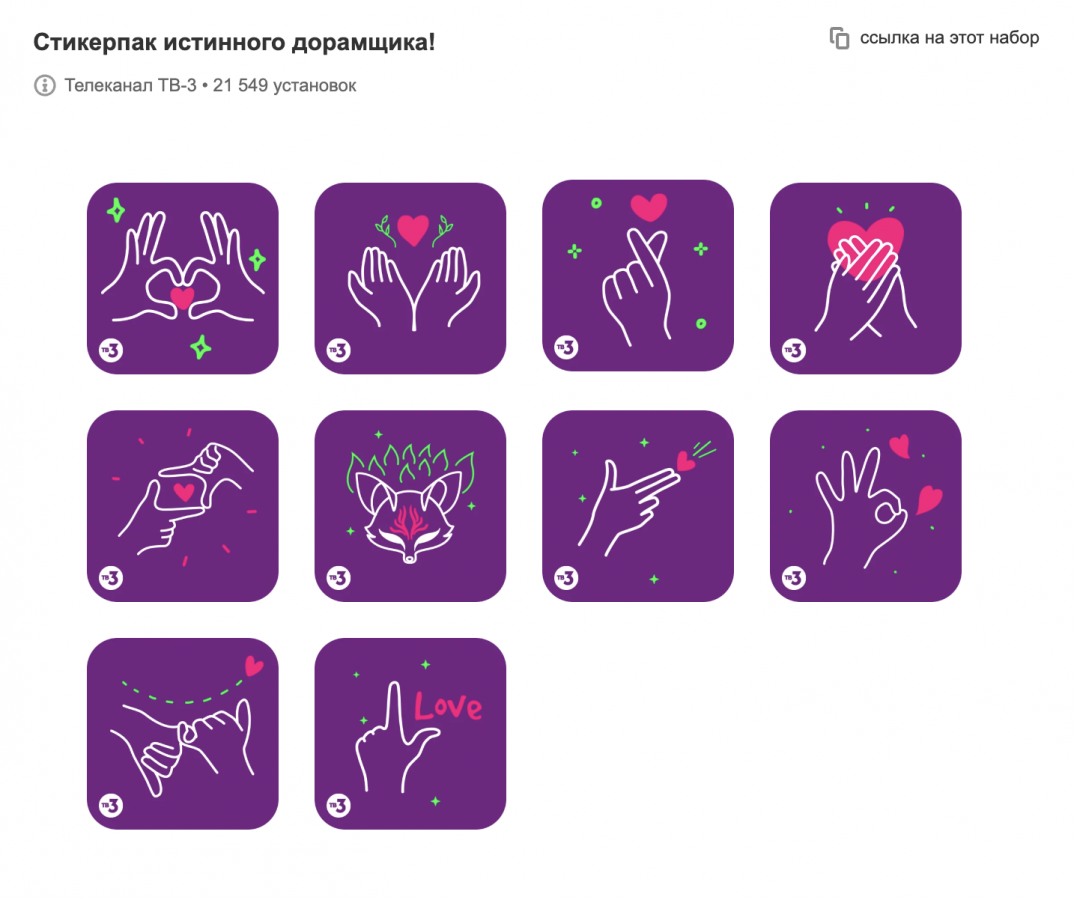 Например, диджитал-команда телеканала создала оригинальный стикерпак. Поскольку к этому времени в соцсетях ТВ-3 уже успело сформироваться своё сообщество любителей дорам, было решено сделать «Стикерпак истинного дорамщика» на основе фирменных узнаваемых жестов из корейской культуры.